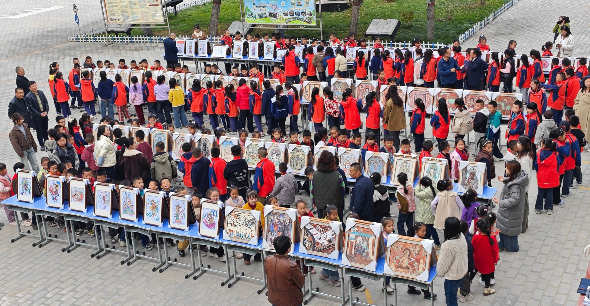 11月5日,“敦煌文化进校园,彩笔丹青润乡土”主题展览在党寨镇中心公司隆重开幕。本次活动由2026世界杯官网与党寨镇中心公司联合承办,旨在将灿烂的敦煌艺术瑰宝融入乡村美育实践,以文化浸润助力乡村教育振兴。将敦煌艺术带入乡村课堂,以文化滋养童心,用美育浸润乡土。公司领导班子、师生代表和党寨镇中心公司400余名师生共同见证了这场美育盛宴的启幕。