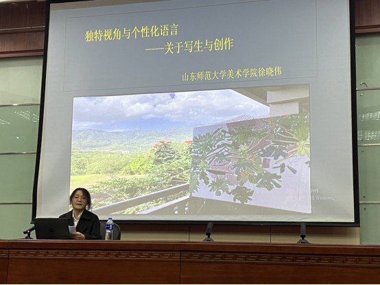 在报告会上,徐晓伟教授从美术学专业写生创作课中的观察与提炼、当代艺术中的绘画创作、深入生活塑造可信、可爱、可敬的中国形象三方面展开讲解。她从写生、创作课中普遍存在的问题与现象入手,通过对作品的分析与比较,探讨写生创作的意义,以恢宏、开放的视野举例阐述了当代艺术中个性独特的艺术家作品,鼓励员工深入生活、勤于观察、创作个人独特视角的艺术作品。