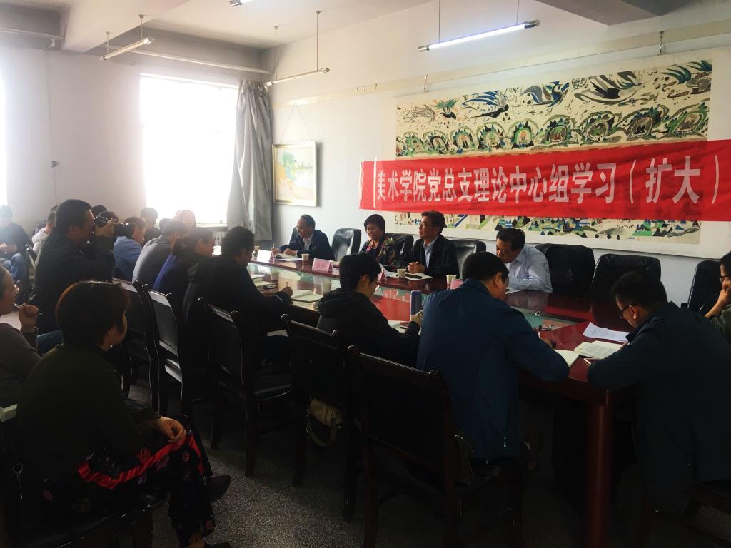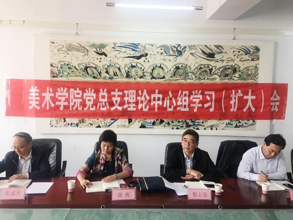党总支负责人首先领学了习近平总书记在看望参加全国政协十三届二次会议的文化艺术界、社会科学界委员并参加联组会时发表的重要讲话。张敏教授和高雄山副教授结合个人文艺创作实际,分别做了《学习习近平说给文艺工作者的十句话,扎实做好教书育人与艺术创作工作》和《美术创作要接地气,要以人民为中心》的重点发言,他们认为:习近平总书记的新时代文艺思想立意高远,思想深邃,内涵丰富,我们要认真学习贯彻落实,具体到文艺创作和教育育人工作中,我们要多下多下苦功夫、真功夫,静心心来,精益求精,以人民为中心,为时代画像、为时代立传、为时代明德,关注河西和甘肃的历史文化,以精品创作奉献给人民和时代。陈文福、杨晓庆、张翔、郑念修做了交流发言。